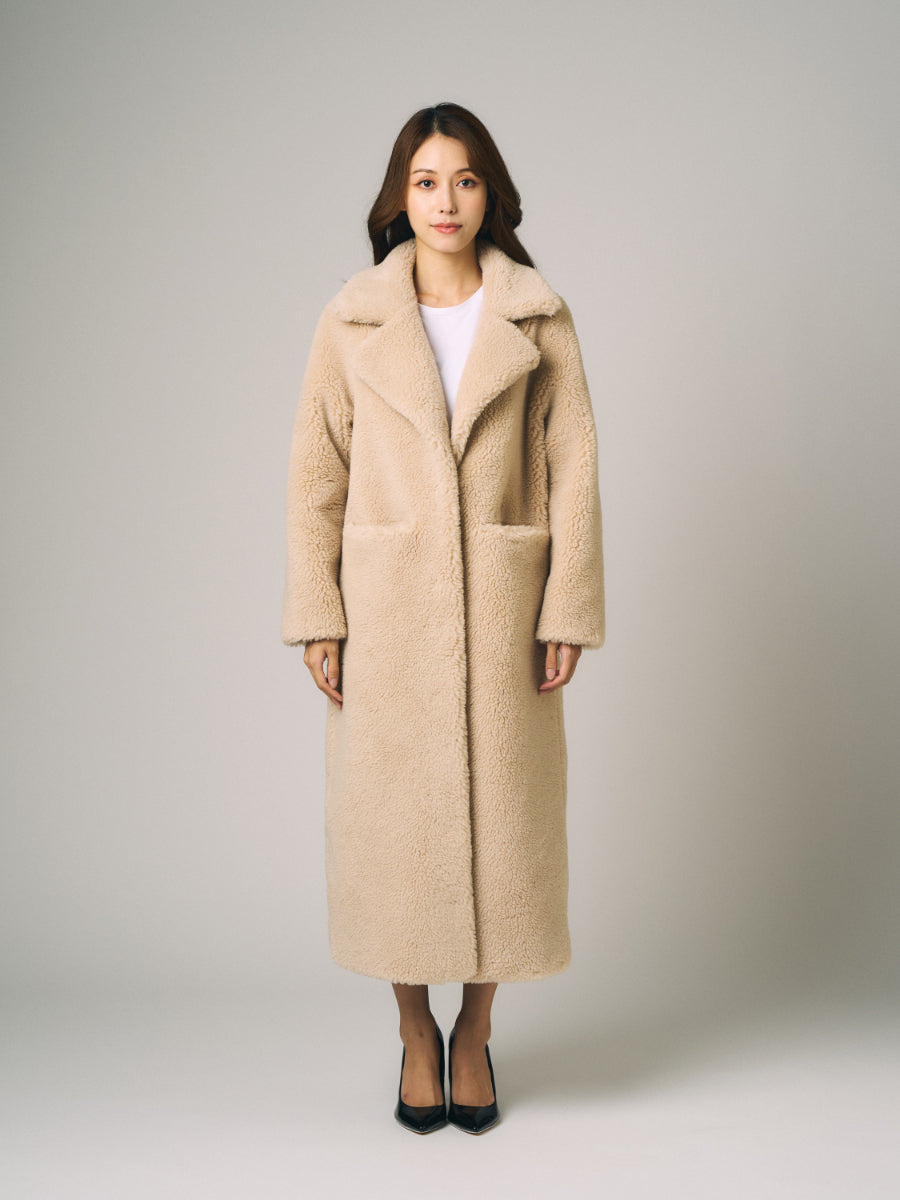 ムートン調の巻き毛が柔らかい印象のたっぷりしたシルエットのウール混のボアコート