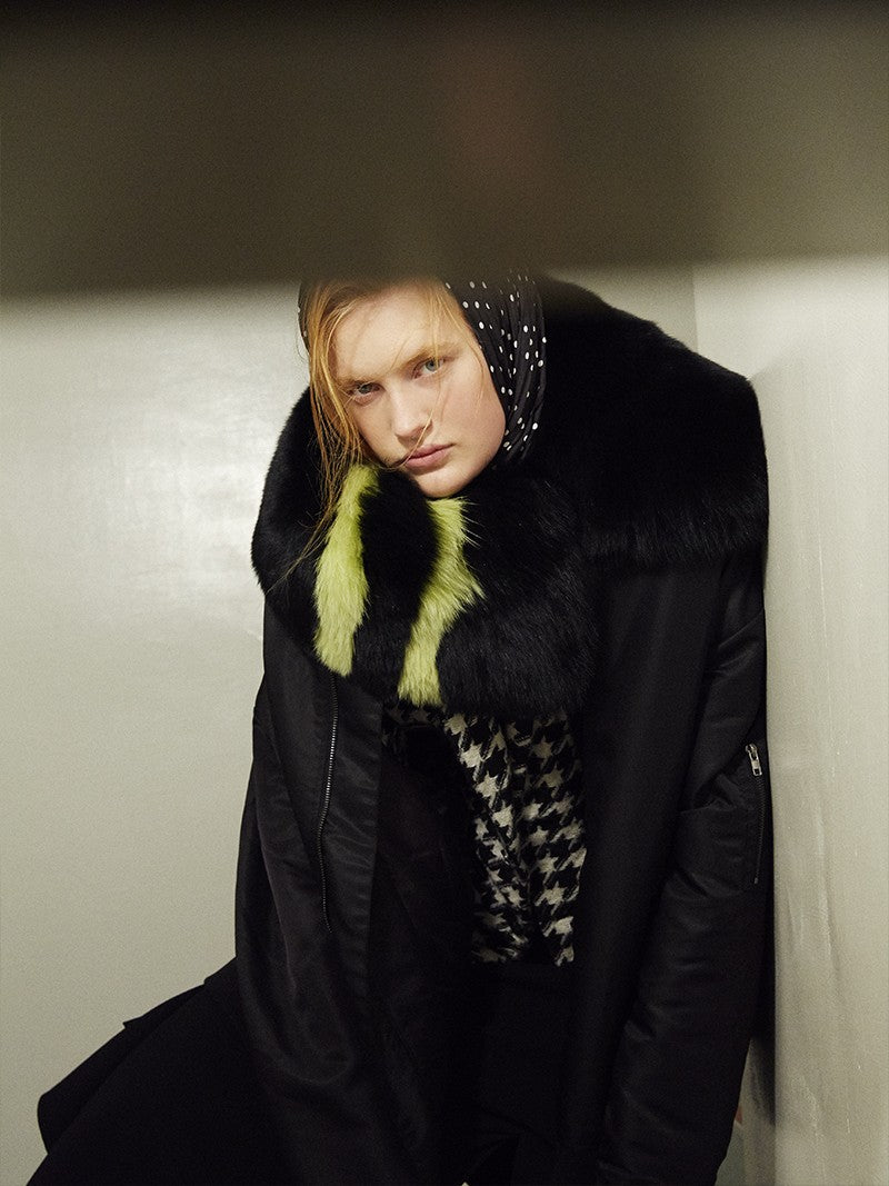 ホックが2ペア付いているので、着用スタイルが変更できます。ボリュームのあるフォックスファーは太めのパンツとの相性も抜群。配色のラインがコーディネートをしやすくしています。