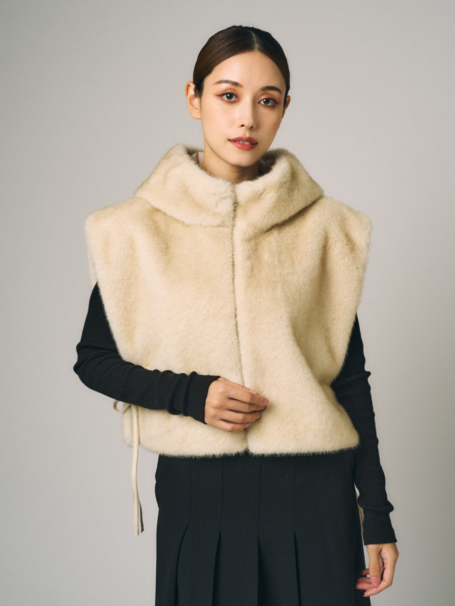 トレンド感のあるミンク風フェイクファーフード付きジップアップベスト。